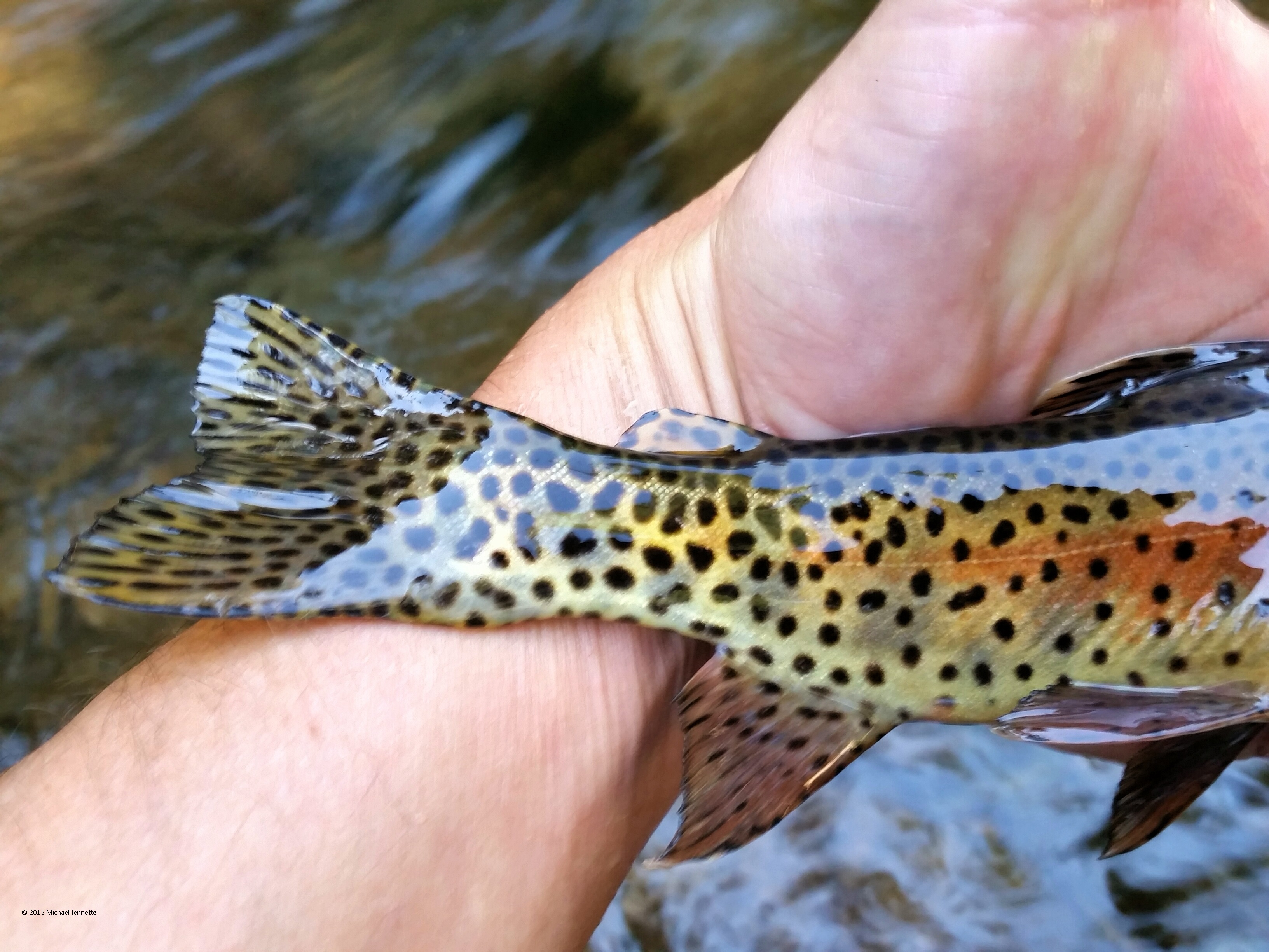 Someone might ask: why photograph small fish, they look the same for the most part? Its a question I’ve asked myself before while taking precious stream time to fumble with cameras and flopping fish amidst flowing water. I’m not sure I had an answer to that question before taking this photo of a little wild brown from a small stream below a blue ridge in western North Carolina. Somehow I “know” this little trout by seeing into her eye. I recognize her desire to feed, and grow and navigate an evolutionary destiny. Does this make me a fish-hugger, probably. Does it make me appreciate not only the outer beauty of trout but the intrinsic value of a living thing; a shared struggle with a co-inhabitant on this majestic, threatening, and threatened planet? Yes, without a doubt! I can think of no better reason to practice safer fish handling or catch-and-release in general. After all, I may know her on a different day by her unique pattern of spots punctuating a brilliant ray of sun behind tail or dorsal fin. Or, I may know her by sighting down the sheen of colorful variegations along a lateral line. One things for sure, I’ll know her like I never have before… and that’s eye opening.